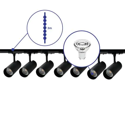 Beschreibung Komplettset 1-Phasen Rail 3 Meter Schwarz | incl. 7x Spot + GU10 2700K 3W Dimmbar + Abschlusskappe, Stromanschluss und I-Verbinder