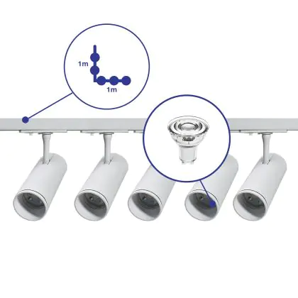 Beschreibung Komplettset 1-Phasen Rail L 1 x 1 Meter Weiß | incl. 5x Spot + GU10 2700K 3W Dimmbar + 1 x 1 Meter Abschlusskappe, Stromanschluss und L -Verbinder