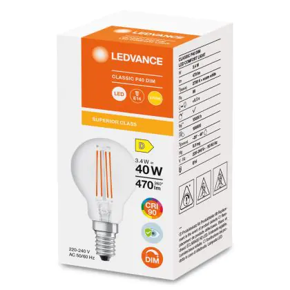 Die Ledvance Classic LED E14 Birne Fadenlampe Klar 3.4W 470lm - 927 Extra Warmweiß | Höchste Farbwiedergabe - Dimmbar - Ersatz für 40W ist eine effiziente E14 LED-Lampe mit Retrodesign und der perfekte Ersatz für Ihre konventionellen 40W Lampen mit E14. Zudem strahlt sie Licht in der Farbtemperatur 2700K - Extra Warmweiß aus und punktet durch eine lange Lebensdauer.