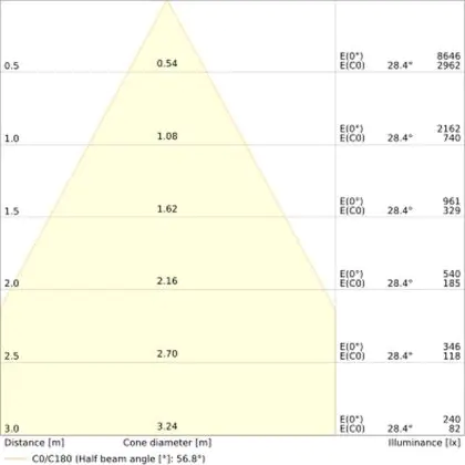 Beispiel: Wird eine Lampe mit einem Abstrahlwinkel von 60 Grad an der Decke (2,5 m Höhe) angebracht, erzeugt sie einen Lichtkegel von 2,9 Metern Durchmesser. Hat die Lampe hingegen einen Abstrahlwinkel von 120 Grad, beträgt der Lichtkegel 8,7 Meter im Durchmesser. |