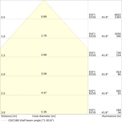 Beispiel: Wird eine Lampe mit einem Abstrahlwinkel von 60 Grad an der Decke (2,5 m Höhe) angebracht, erzeugt sie einen Lichtkegel von 2,9 Metern Durchmesser. Hat die Lampe hingegen einen Abstrahlwinkel von 120 Grad, beträgt der Lichtkegel 8,7 Meter im Durchmesser. |