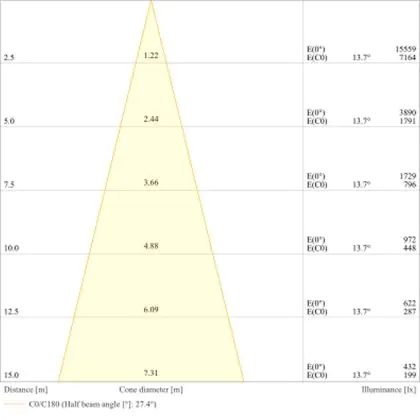 Beispiel: Wird eine Lampe mit einem Abstrahlwinkel von 60 Grad an der Decke (2,5 m Höhe) angebracht, erzeugt sie einen Lichtkegel von 2,9 Metern Durchmesser. Hat die Lampe hingegen einen Abstrahlwinkel von 120 Grad, beträgt der Lichtkegel 8,7 Meter im Durchmesser. |