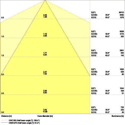 Beispiel: Wird eine Lampe mit einem Abstrahlwinkel von 60 Grad an der Decke (2,5 m Höhe) angebracht, erzeugt sie einen Lichtkegel von 2,9 Metern Durchmesser. Hat die Lampe hingegen einen Abstrahlwinkel von 120 Grad, beträgt der Lichtkegel 8,7 Meter im Durchmesser. |