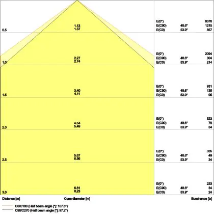 Beispiel: Wird eine Lampe mit einem Abstrahlwinkel von 60 Grad an der Decke (2,5 m Höhe) angebracht, erzeugt sie einen Lichtkegel von 2,9 Metern Durchmesser. Hat die Lampe hingegen einen Abstrahlwinkel von 120 Grad, beträgt der Lichtkegel 8,7 Meter im Durchmesser. |